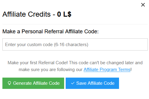 No confusing active customers, all payments made using your affiliate code get credited to you. You can withdraw affiliate credits to your Moonbots wallet or as lindens